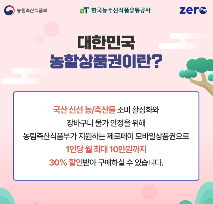 국내산 신선 농·축산물 소비 활성화를 위해 발행되는 모바일 상품권으로 1인당 월 최대 10만원까지 구매할 수 있습니다.